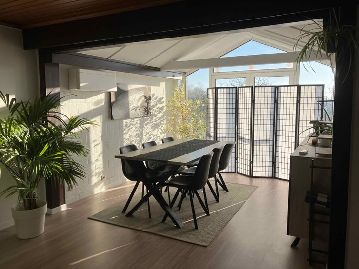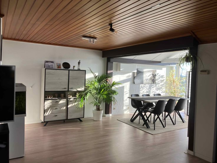 Ruime open living met laminaat, eetruimte met uitzicht op de tuin.