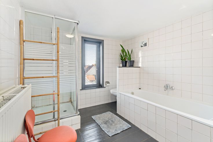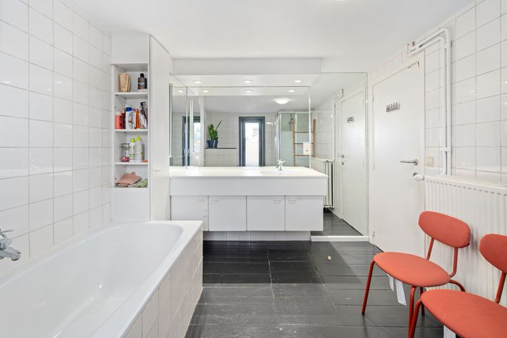 2de verdiep 40m² : ruime slaapkamer en badkamer met ligbad, douche en dubbele lavabo in meubel.