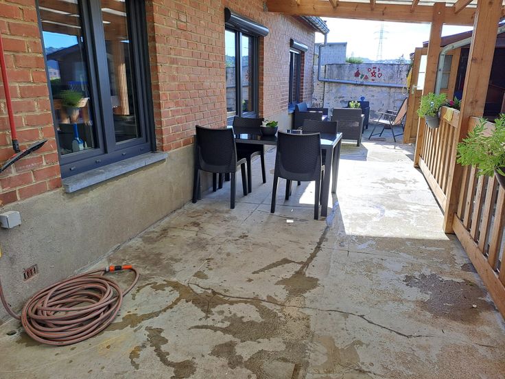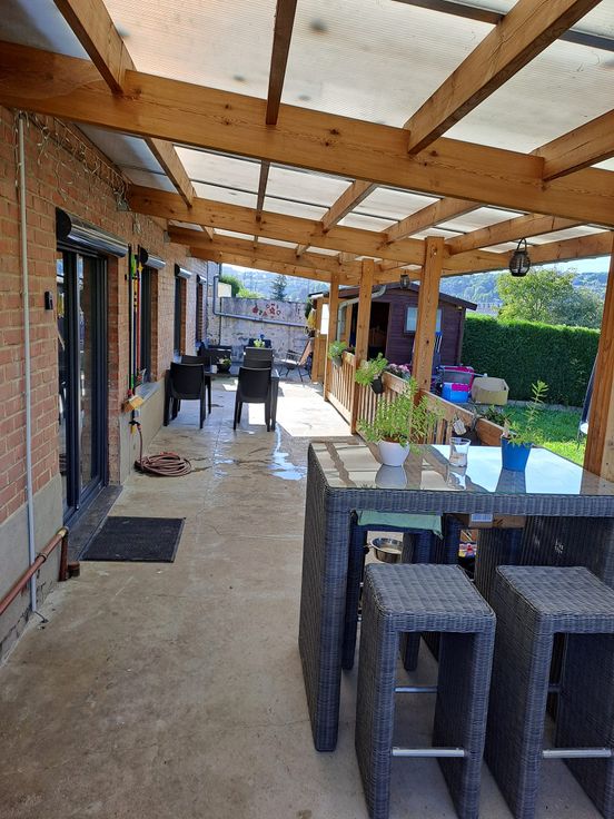 Pour ce qui est de son extérieur, la maison dispose d'une grande terrasse de béton de 15m sur 3, couverte sur 12m de L par une pergola récente. Un chalet en bois y est également présent, alimenté en électricité.