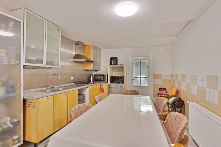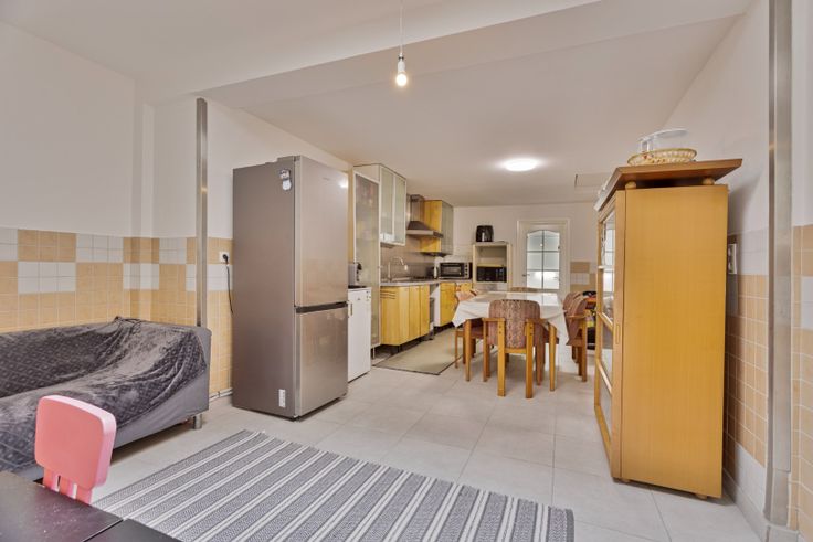 Bij binnenkomst word je begroet door een ruime woonkamer. Aansluitend vind je de eetkamer, de keuken en daarachter de keuken.