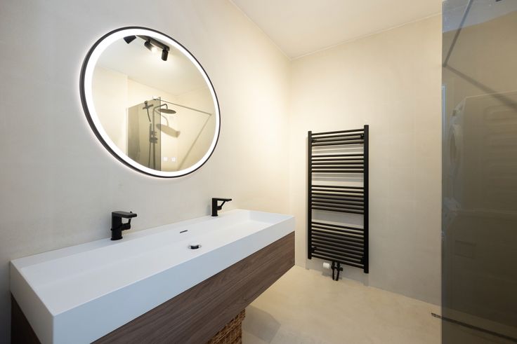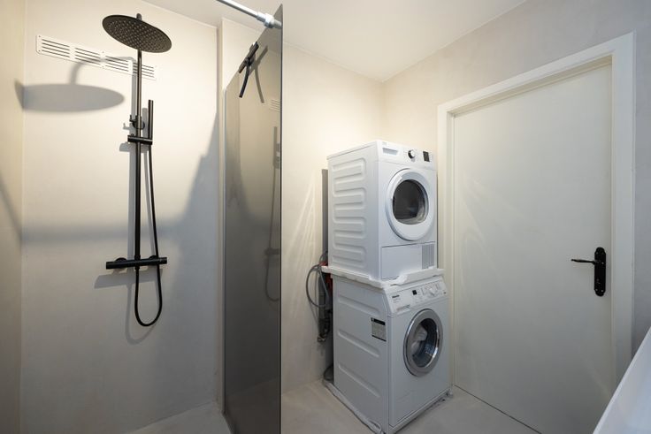✅ Elegante Badkamer & Apart Toilet: Een moderne badkamer met inloopdouche, verlichte spiegel en ruimte voor een wasmachine en droger.