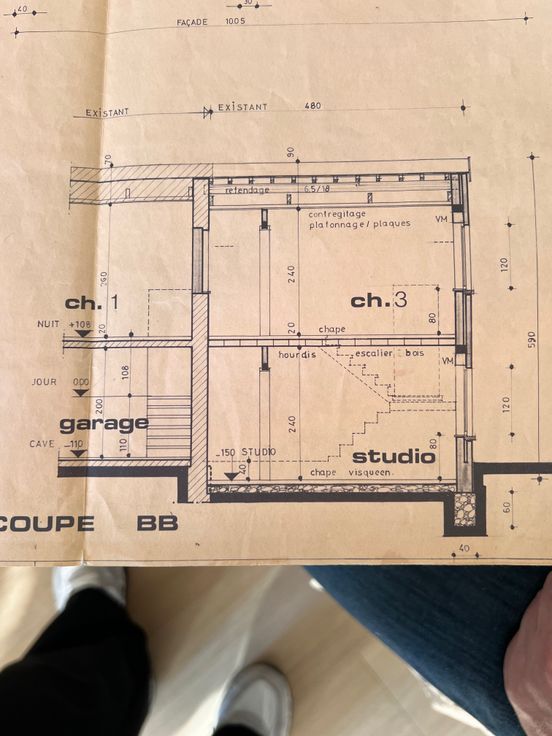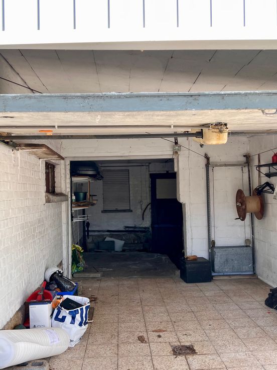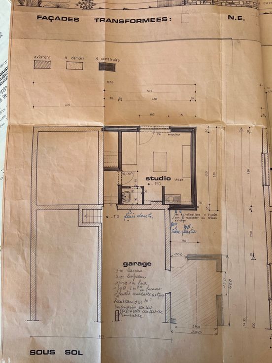 Au niveau inférieur (non enterré) se trouvent deux garages ainsi qu'un studio avec douche et évier, équipé d'un poêle à bois avec accès au jardin et terrasse.