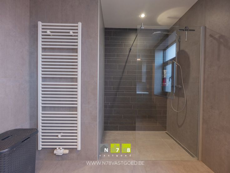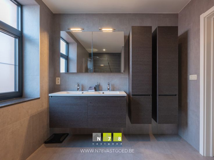 - Badkamer (7,84m²): tegelvloer; geïnstalleerd met inloopdouche, dubbele lavabo, onderkasten, lades, spiegelkast, kolomkasten.