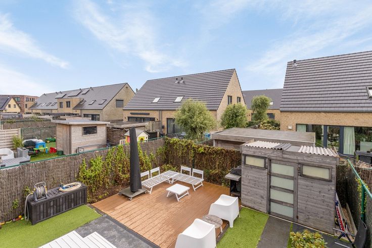 De woning is aan de zijkant voorzien van een toegang tot de tuin zodat fietsen veilig weggeplaatst kunnen worden. Zonnepanelen, kunstgras (weinig onderhoud), een zongericht terras en een tuinhuis zijn een extra troef. Voor de woning is er parkeerplaats voorzien voor 3 tot 4 auto's.