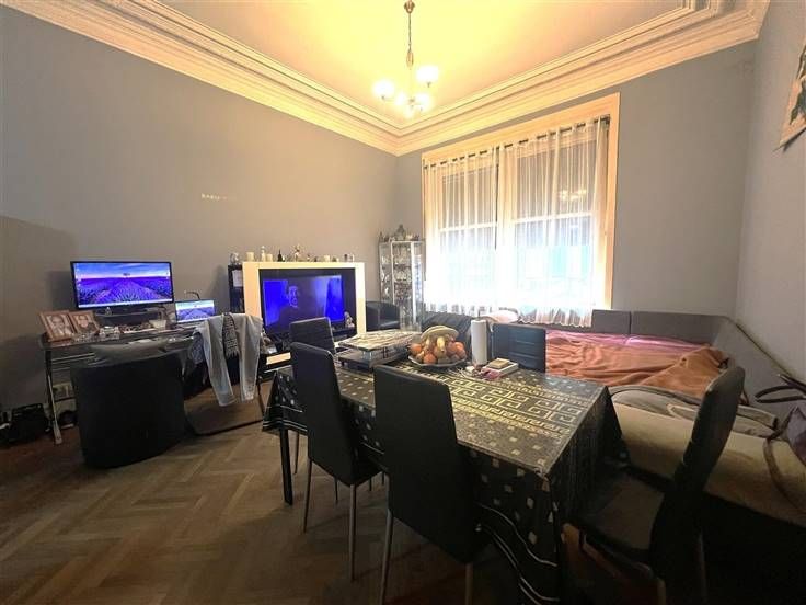 Sorry er is geen nederlandse vertaling beschikbaar. Au cœur d'Ixelles entre le Bd Gén Jacques & les Etangs d'Ixelles, à proximité immédiate de la Pl Flagey, dans un quartier recherché, parfaitement desservi par les transports en commun et bénéficiant de la proximité de nombreux commerces, écoles et parcs Spacieux Appartement de +/- 87 m² (selon normes PEB), à rénover et situé au RDC d'une petite copropriété de 4 unités. Il se compose d'un Séjour de +/- 25 m² avec parquet, d'une Cuisine équipée de +/- 14 m², d'un Dégagement à l'arrière avec WC indépendant, de 2 Chambres à coucher de +/- 15 & 9 m² avec plancher et accès à la Cour arrière, d'une Salle de bain (baignoire, douche, & 2 lavabos) et de la jouissance privative et exclusive de la Cour arrière de +/- 40 m². Un Espace commun pour garer les vélos et 1 Cave privative complètent cet ensemble.