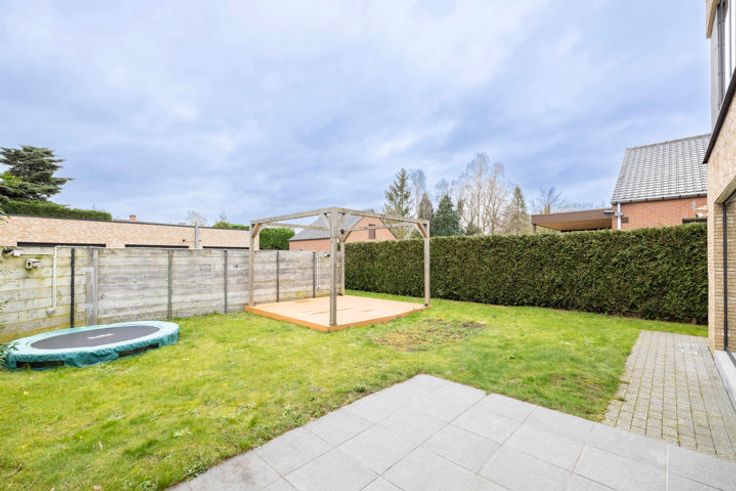 De woning beschikt over een onderhoudsvriendelijke tuin met terras. Achteraan zijn 2 garages beschikbaar met automatische sectionale poort.