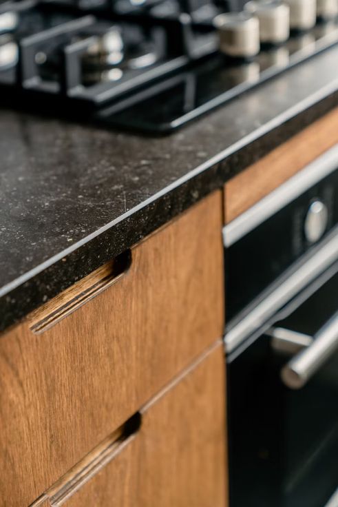 - Ruime, lichte woonkamer met ingebouwde boekenkast en open keuken met eiland. Warme houten kasten en natuurstenen werkblad zorgen voor tijdloze uitstraling.
