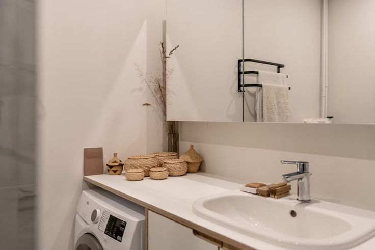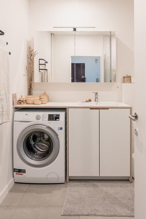 - Moderne badkamer met inloopdouche en meubel met ruimte voor wasmachine.