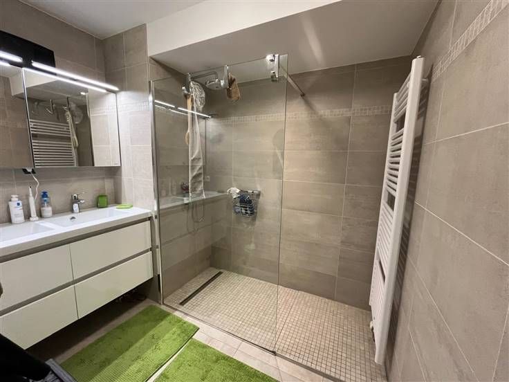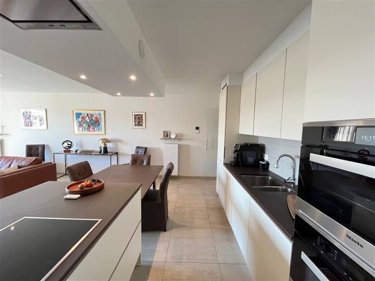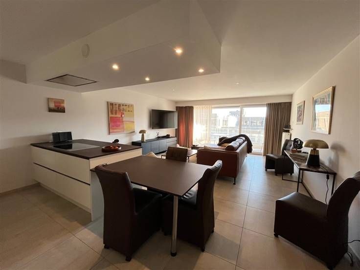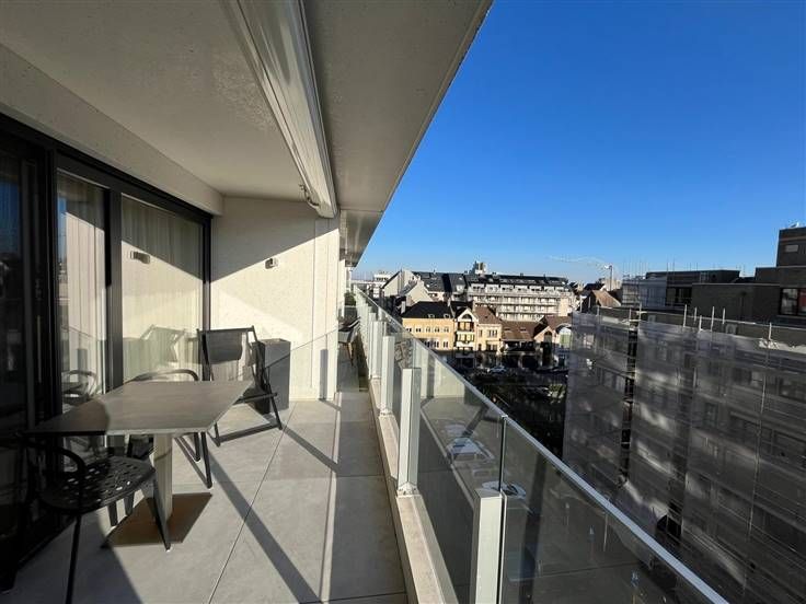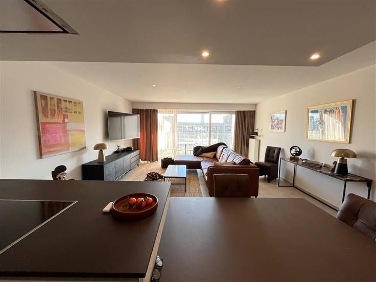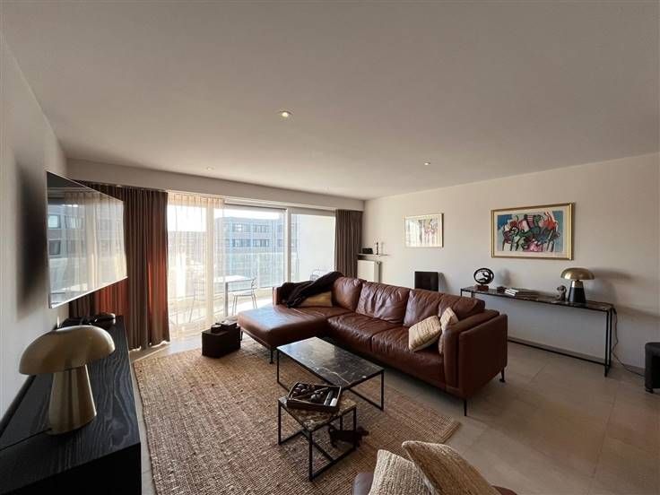 Stijlvol, modern luxe-appartement gelegen op de 6de verdieping in een recente residentie. Het appartement bestaat uit een inkomhal, ruime en lichtrijke woonkamer met grote ramen die toegang bieden tot het zuidgericht terras, open keuken voorzien van hoogwaardige inbouwapparatuur en stijlvol afgewerkt met veel bergruimte, 2 slaapkamers waarvan één ingericht als dressing/bureel, badkamer met dubbele lavabo en inloopdouche, apart toilet en berging met aansluiting voor wasmachine en droogkast. Garagebox in het gebouw inbegrepen. Het is mogelijk om dit appartement gemeubeld te huren of om deze kwaliteitsvolle meubelen over te nemen. Vrij vanaf 15/03/2025. Provisie algemene kosten: €60/maand. .