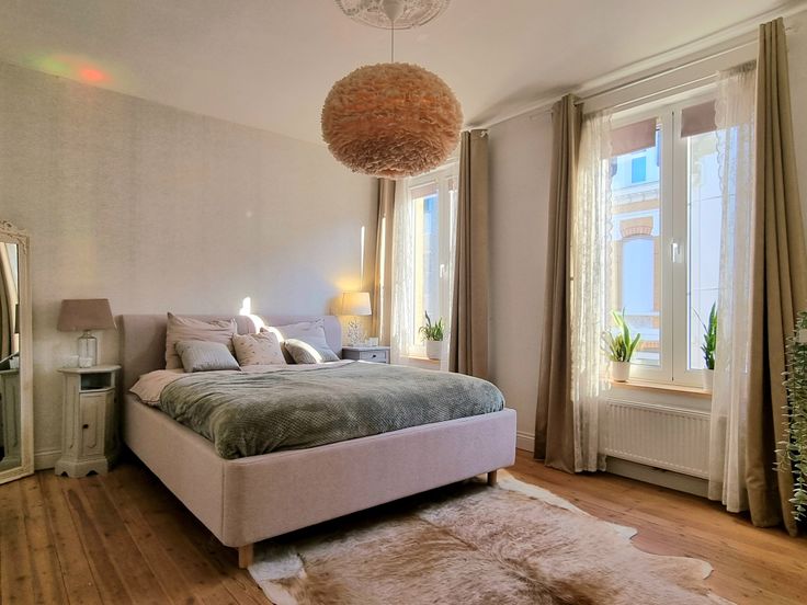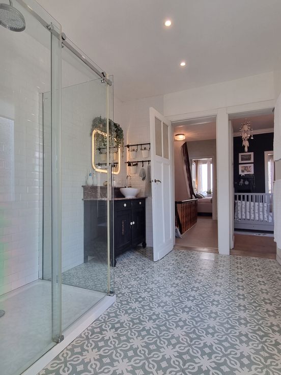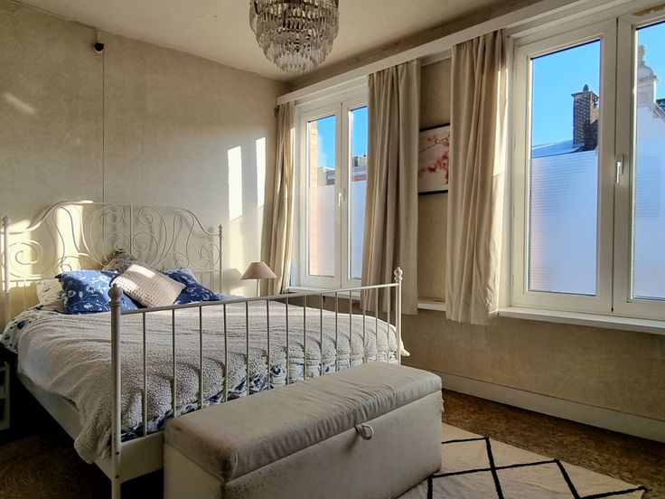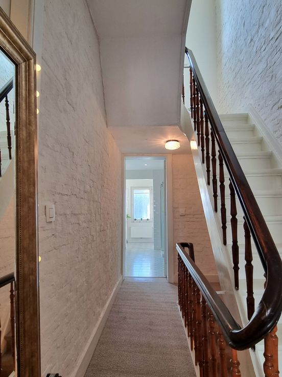 Op de eerste verdieping bevindt zich de master bedroom met veel lichtinval en een authentieke houten vloer. De tweede slaapkamer, eveneens op houten vloer, heeft ingemaakte kasten. De badkamer beschikt over een inloopdouche en een wasplaats met toilet. Op de tweede verdieping zijn twee slaapkamers die nog gerenoveerd dienen te worden.