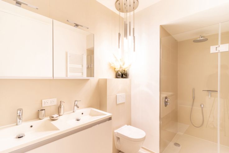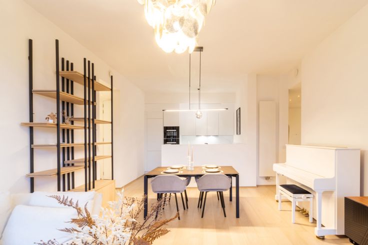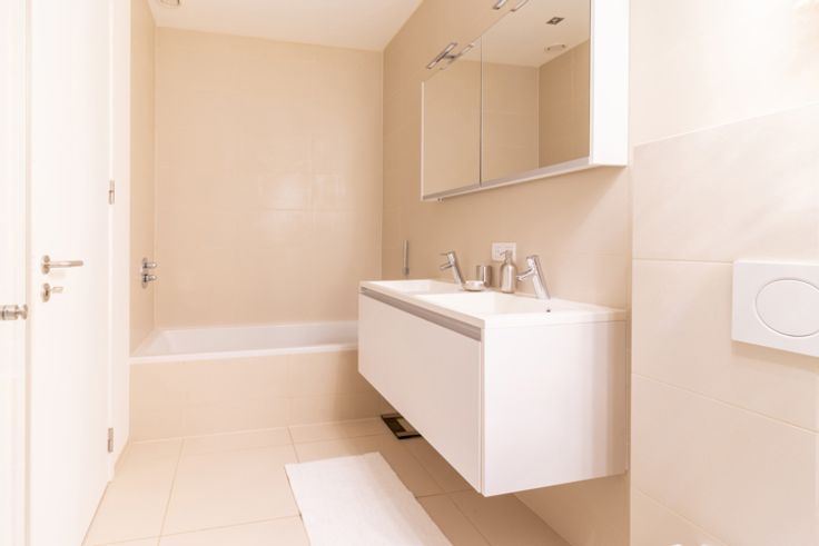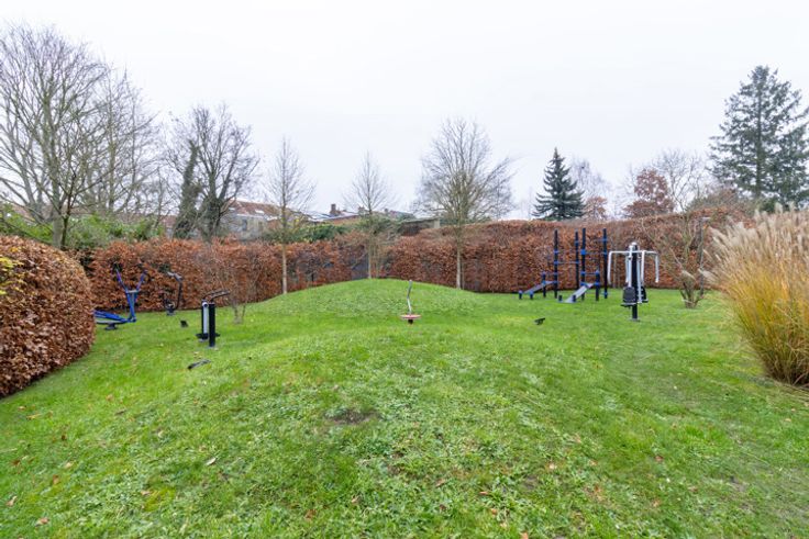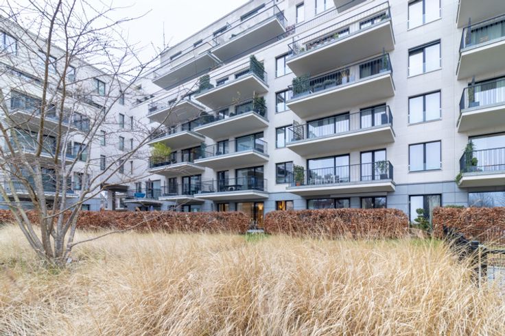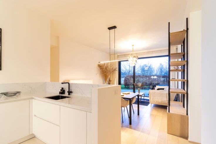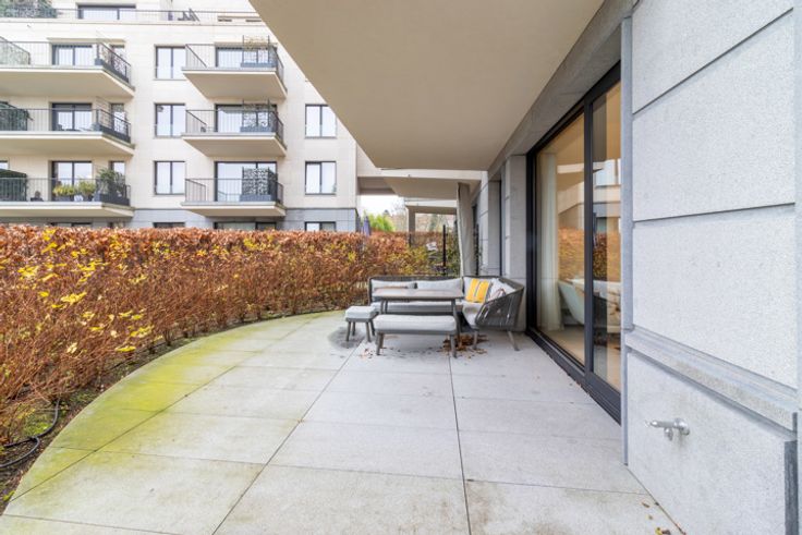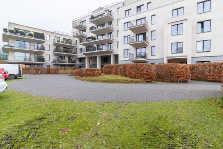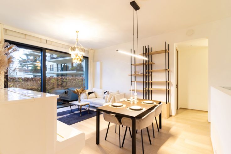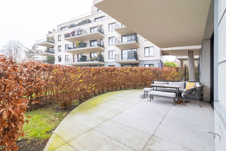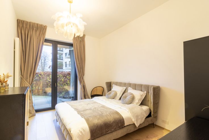 Inkomhal met apart toilet en ingebouwde kasten, ruime en lichte woonkamer van ±36 m², die rechtstreeks uitgeeft op een terras en een privétuin van ±35 m². Moderne, volledig uitgeruste open keuken met inductiekookplaat, afzuigkap, oven, magnetron, vaatwasser, koelkast, vriezer en veel opbergruimte. Nachthal die leidt naar twee slaapkamers (14,5 m² en 11,5 m²), elk met toegang tot het terras op het zuidwesten. Badkamer met bad, inloopdouche, dubbele wastafel en wandcloset. In de kelder is er een overdekte parkeerplaats (toeslag van €150/maand), uitgerust met een oplaadpunt voor elektrische voertuigen, evenals een privékelder. Er is ook een wasstraat beschikbaar. Maandelijkse servicekosten: €275, inclusief verwarming, warm water, toegang tot de carwash, conciërge en alle gemeenschappelijke kosten van het gebouw.