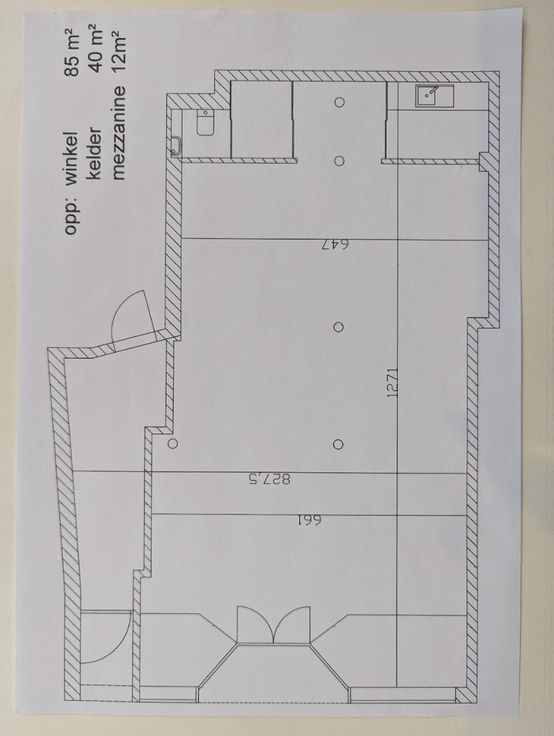 Oppervlakte winkel 85 m² + kelder 40m² + mezzanine 12m²