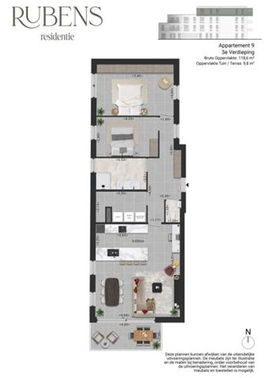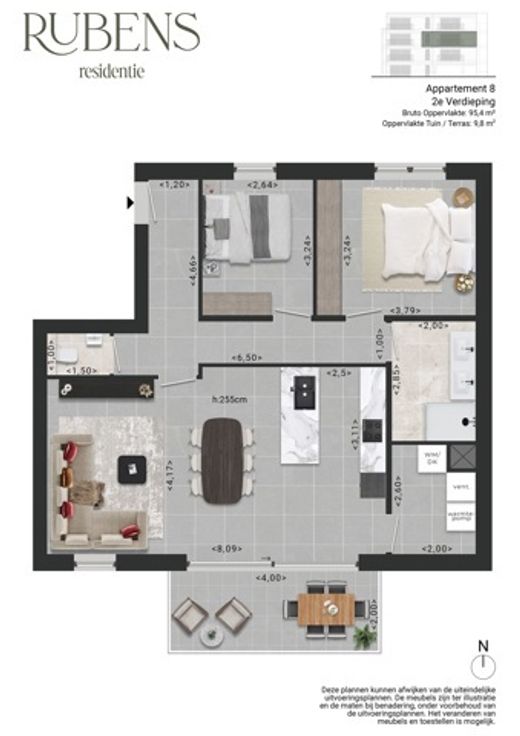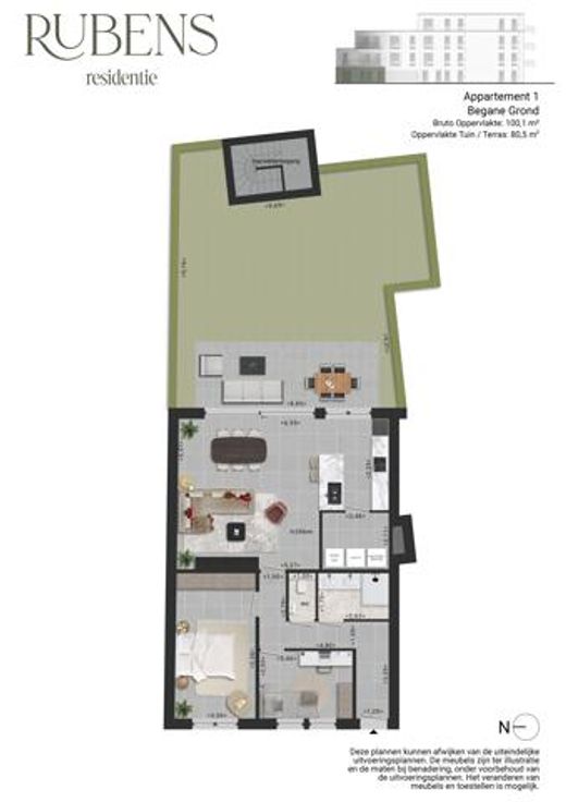 Bent u op zoek naar een ruim appartement in hartje Turnhout, dan wordt "Residentie Rubens" misschien wel uw nieuwe thuis. Deze kleinschalige residentie wordt weldra opgericht net binnen de stadsring, pal aan een aangename fiets- en wandelroute tussen het Stadspark, het ziekenhuis en het centrum. Dit zijn 10 ruime appartementen van 93m² tot 138m² en 2 volwaardige slaapkamers, een lichte leefruimte met open keuken en heerlijke terrassen met de ideale zonoriëntaties. 2 appartementen hebben bovendien een eigen, aangelegde tuin. U geniet hier een optimaal wooncomfort dankzij een goed uitgekiend indelingsplan, waardoor de ruimte in ieder appartement optimaal benut wordt. In de basisprijs is een mooi budget inbegrepen voor een stijlvolle inrichting. De eerste 2 kopers genieten van een bijzondere lanceringsactie: 10.000 EUR extra budget voor de verdere afwerking van uw keuken, vloeren en/of badkamer. De lift brengt u tot in de kelder met staanplaatsen, bergingen en een afvalberging. Uw fietsen stalt u veilig in de fietsenstalling op het gelijkvloers. Dit zijn echte BEN (Bijna Energie Neutraal) appartementen dankzij de allernieuwste technieken: Zonnepanelen, warmtepomp, regenwaterrecuperatie, ventilatie D,... De prijzen starten betaalbaar vanaf 285.000 EUR excl. kosten. Wij bezorgen u graag een prijsberekening inclusief staanplaats, kelderberging en kosten. Bekijk het project hier op onze website: https://deboerenpartners.be/6553413/nieuwbouwproject-residentie-rubens/home