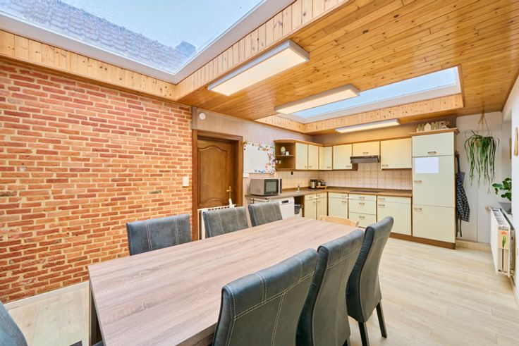 Zeer ruime instapklare gezinswoning met een ruime bewoonbare oppervlakte in het centrum van Linde-Peer op een perceel van 5a 42ca. Deze ruime en lichtrijke gezinswoning biedt tal van mogelijkheden. De woning kende de laatste jaren al enkele vernieuwingen (leidingen - dak - isolatie - ...) en is klaar voor nieuwe bewoners. Scholen, winkel en openbaar vervoer in de nabije omgeving. Omgeven door groen, doch kortbij het centrum van Peer. De indeling is als volgt: * Gelijkvloers: Inkomhal met toegang tot de lichtrijke bureau, slaap-of speelkamer. Naast de bureau is de zeer ruime leefruimte gelegen met open keuken en grote eetruimte/veranda. De keuken is voorzien van 2 lichtkoepels die voor voldoende licht zorgen. Via de achterinkom is een aparte berging te vinden die uitgeeft op de keuken, een badkamer met lavabo, douche en een apart toilet. * Verdieping: op de eerste verdieping zijn er 3 ruime slaapkamers en een verder af te werken badkamer. Een lavabo, toilet en leidingen voor een douche zijn reeds voorzien. Een vaste trap vanuit de nachthal naar de zolder is aanwezig. De zolder kan afgewerkt worden en ingericht worden als extra leefruimte. * Kelder: Een kleine voorraadkelder is voorzien en is te bereiken vanuit de leefruimte. De tuin is volledig omheind en voorzien van voldoende bergruimte omgeven door groen. PVC ramen, dubbele beglazing - verwarming op aardgas - dak vernieuwd - isolatie (spouwmuur + dak) aanwezig. Manuele rolluiken op de bovenverdiepings alsook een elektr