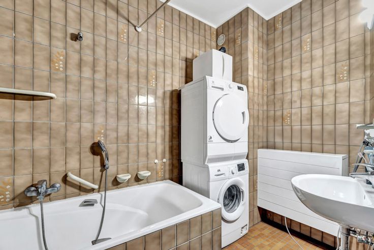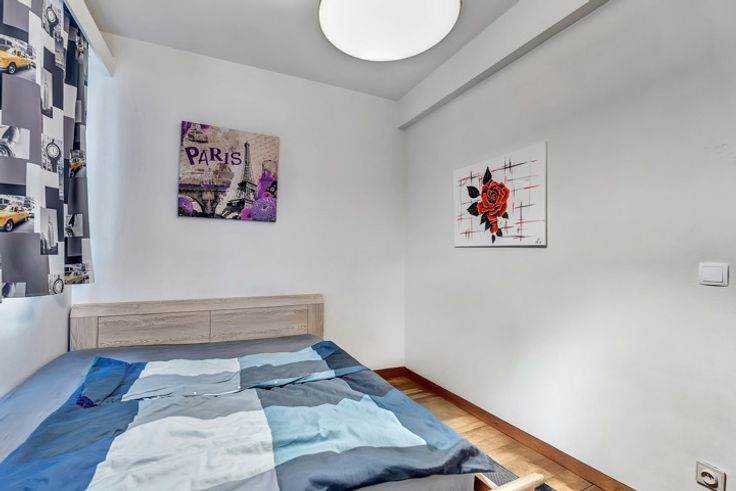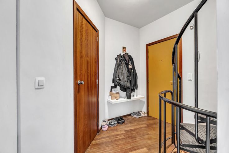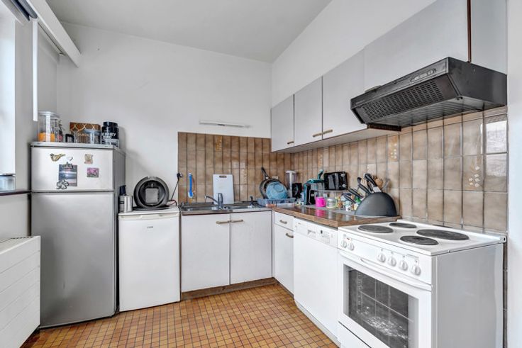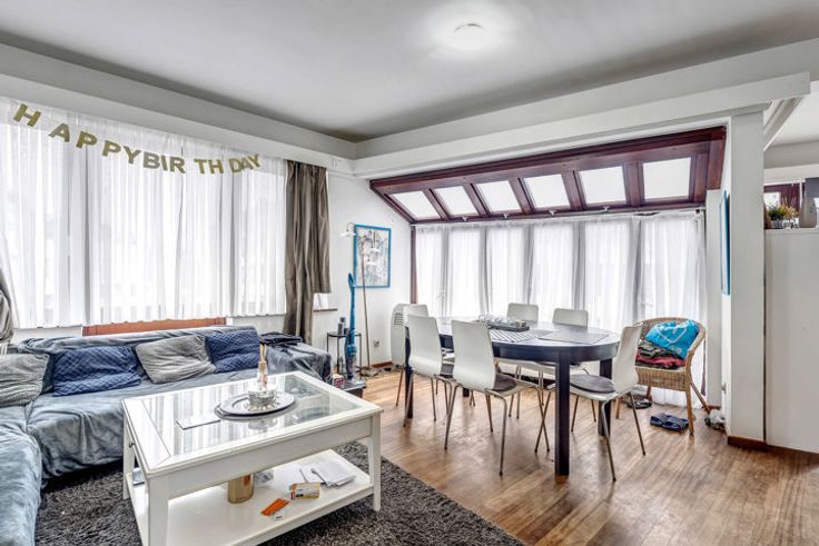 Het duplexappartement (100m²) geniet van een ruime, lichtrijke woonkamer met aansluitend de keuken, twee toiletten, twee grote slaapkamers en een badkamer met ligbad.