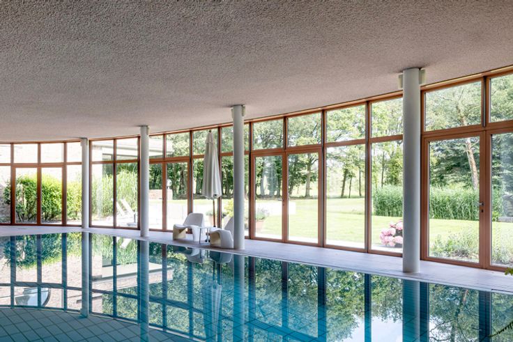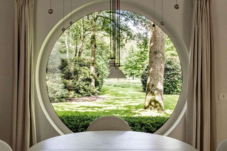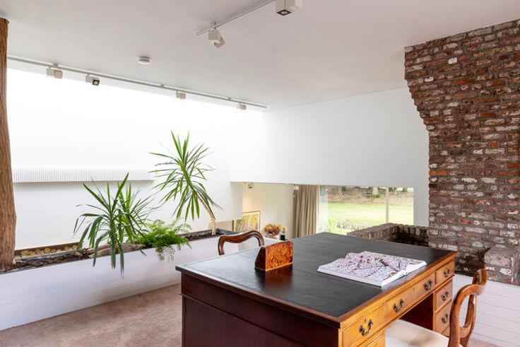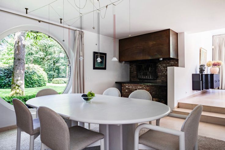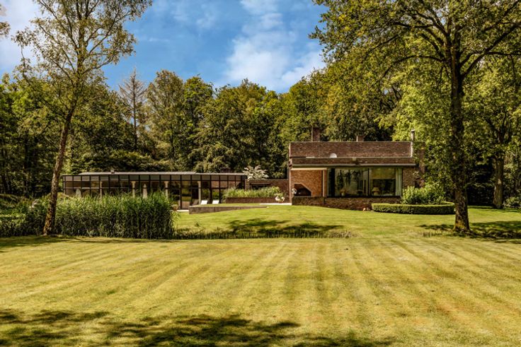 In 1975 ontwierp architect Paul Schellekens deze villa met boeiende contrasten in texturen, ruwe materialen, geometrische en massieve volumes, accentmuren in baksteen, split-levels... – de Turnhoutse School op haar best, én bovendien energetisch geoptimaliseerd met o.a. zonnepanelen, geothermische warmtepomp, isolatie, airco... De lichtrijke hal zorgt voor een indrukwekkende entree met plafond in zichtbeton, vast tapijt en natuursteen. Binnen lopen de split-levels mooi in elkaar over: knusse zithoek met open haard, woonkamer met unieke raampartijen en fenomenaal tuinzicht, op niveau het 1ste bureau, supergezellige eetkamer met open haard én BBQ. Ernaast, de moderne keuken (Miele, Gaggenau) met bijkeuken. Het zonovergoten landgoed met tuin en tennisveld is een unieke plek voor spelende kinderen, rustzoekers, levensgenieters én sportievelingen. Rechts van de inkomhal: 2de kantoor en de hoofdslaapkamer met en suite dressing, badkamer en zalig zicht op de binnentuin. Binnenzwembad met riante glaspartijen, terrassen, wellness, sauna, fitness en de 3de houthaard. Prachtige spiltrap naar de 1ste verdieping met 4 ruime slaapkamers en 2 badkamers. Voorraad- en wijnkelder. Garage voor 3 wagens. Verbluffend modernisme op een uniek landgoed – voor ware fijnproevers.