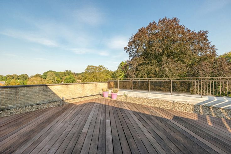 Het ruime terras van maar liefst 65 m², uitgevoerd in hardhout en voorzien van verlichting, biedt een prachtig zicht op het omliggende groen en is ideaal georiënteerd op het zuidoosten.