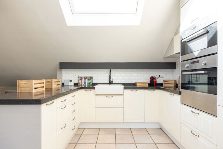 De open keuken is volledig uitgerust met toestellen, waaronder een keramische kookplaat, koelkast, vaatwasser, combioven, heteluchtoven, dampkap en spoelbak, en is voorzien van een werkblad in blauwe steen.