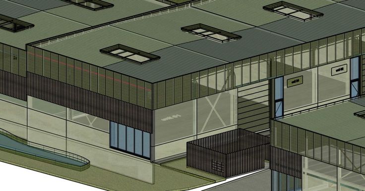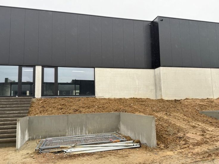 - Gevelafwerking: Betonnen plint tot 2,2 meter, met sandwichpanelen van 100 mm isolatie en een houtlook lamellenstructuur