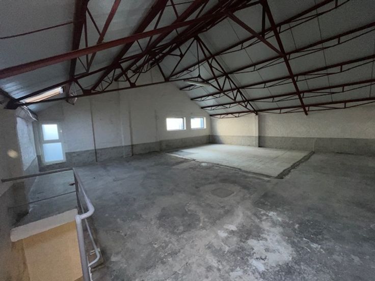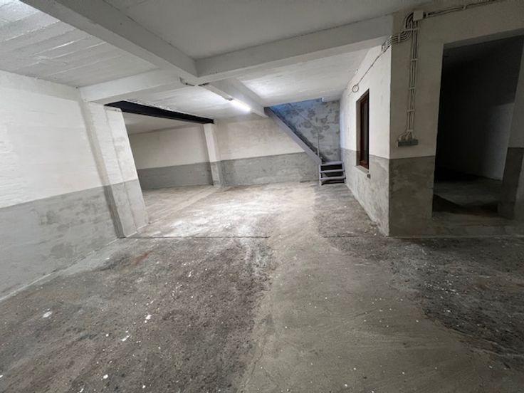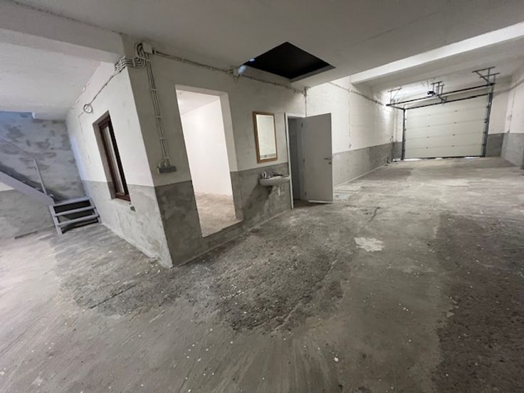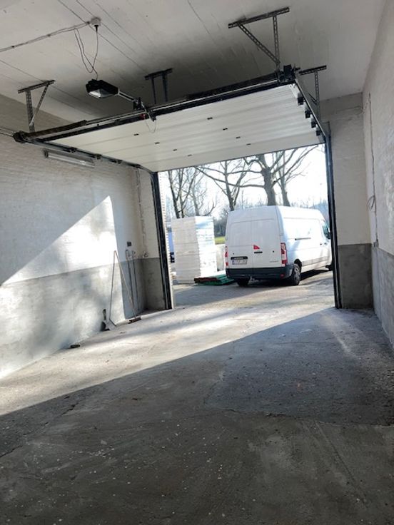 magazijn, gelijkvloers en verdieping, geschikt voor talloze doeleinden, goede ligging dicht bij invalswegen, grote inkom deur met sectionale poort H3m5 B3m35, met bureau en wc, voor meer informatie 0475-329-551
