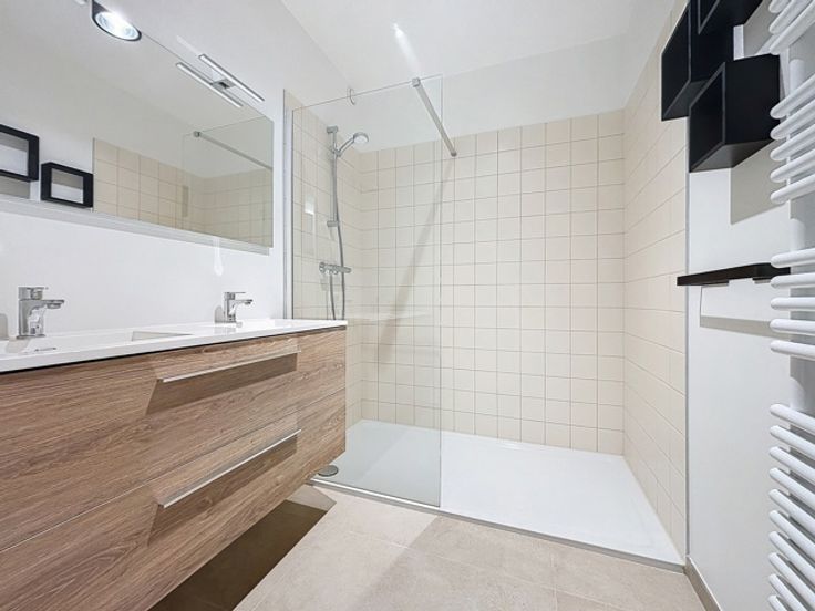 Une salle de douche élégante avec meuble double vasque et WC, un WC séparé dans l’entrée ainsi qu’une buanderie pratique et bien aménagée complètent l’appartement.