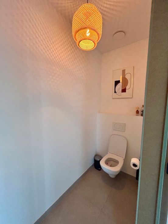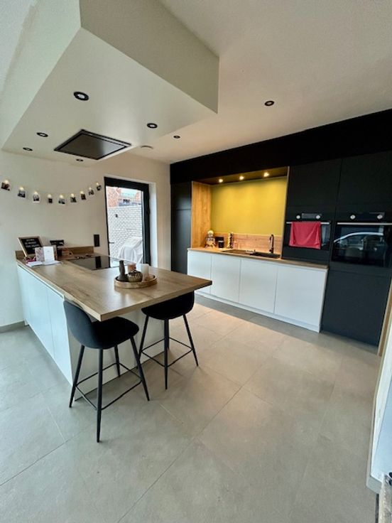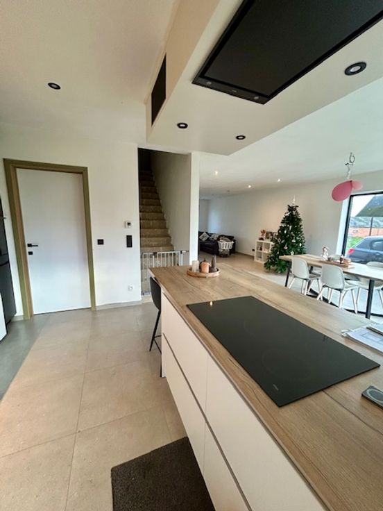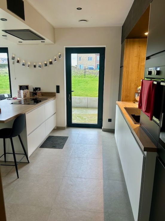 Gelijkvloers: U komt binnen in een ruime inkomhal met aansluitend een apart toilet, het is een open leefruimte met open keuken. De keuken is uitgerust met een dampkap, inductie kookplaat, microgolfoven, oven, warmhoudlade en een vaatwasmachine. Naast de keuken bevindt zich een ruime berging.