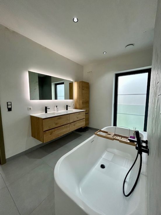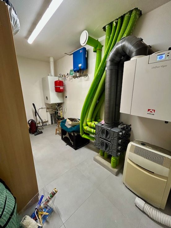Het huis is uitgerust met centrale verwarming op aardgas, zonnepanelen, regenwaterput ( 10000 liter) , ventilatiesysteem type D, aluminium ramen met dubbele beglazing.