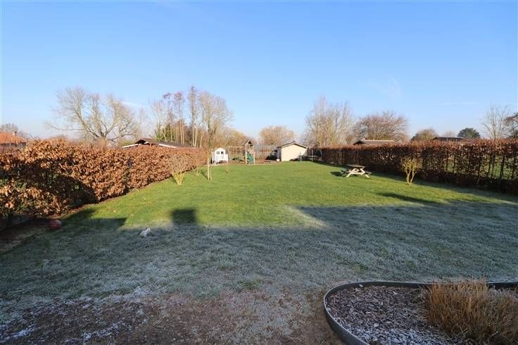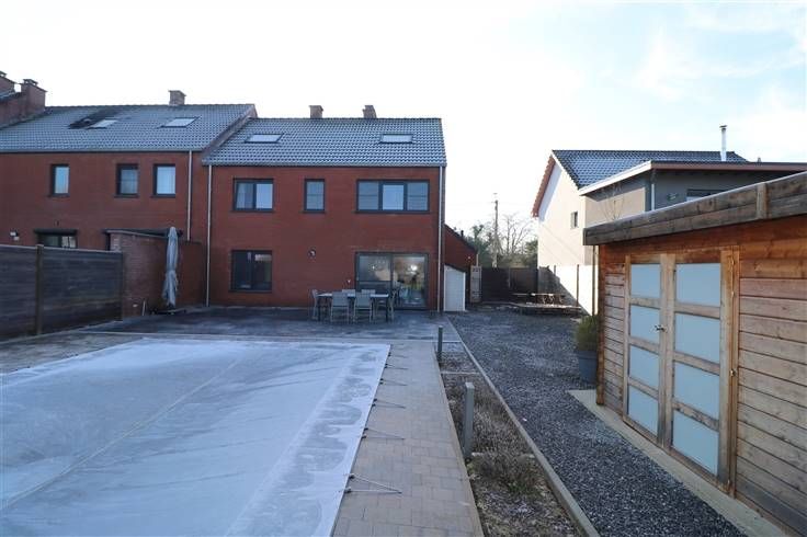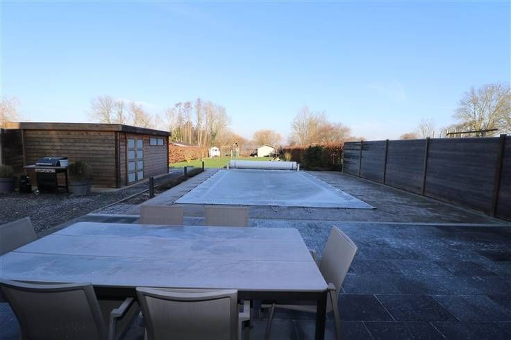 Piscine (8x4) chauffée (pompe à chaleur) avec volet de sécurité, parking avant, passage latéral fermé, terrasse en pierre bleue, 2 abris de jardin, …