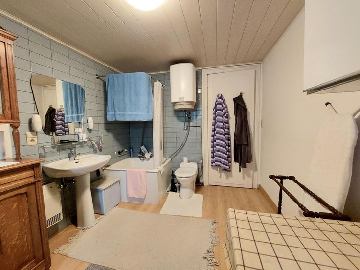 - ruime badkamer : lavabo, douche (zitbad) en toilet