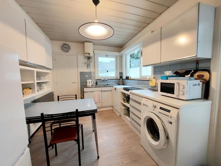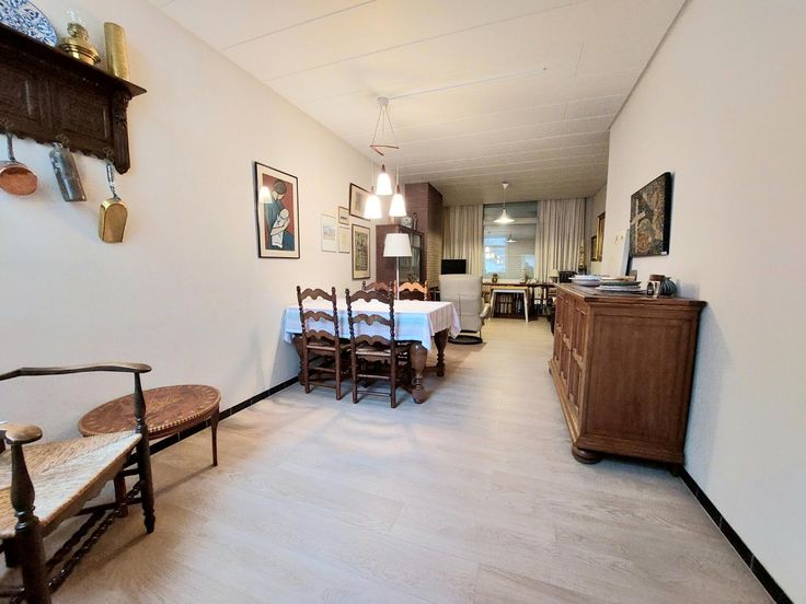 - ingerichte keuken met onder- en bovenkasten en eethoek