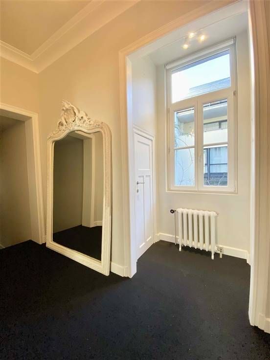 Ligging: In de historische wijk van de Grote Markt, op een steenworp afstand van de Place de la Vieille Halle aux Blés, prachtig appartement met hoge plafonds, volledig gerenoveerd op de 1ste verdieping, in een rustig kleine straat zeer dichtbij de Zavel, openbaar vervoer, winkels en restaurants. Beschrijving: Appartement gelegen op de 1ste verdieping van een gebouw uit 1900, met een oppervlakte van +/- 145 m2, volledig gerenoveerd met charme en smaak, met twee mooie grote slaapkamers, elk met een aangrenzende douchekamer. Kleine mede-eigendom met 4 éénheden, weinig gemeenschappelijke lasten. Een pand met veel charme en in perfecte staat. Indeling: Inkomhal, apart toilet, vestiaire/berging, volledig ingerichte openkeuken met eetkamer, woonkamer, lange mooie gang met tapijt gevende op 2 mooie slaapkamers (20 en 18 m2) elk met een douchekamer, een wastafel en een toilet alsook kastenwand, bergruimte voor washok, . Nieuwe individuele gasketel, beveiligde deur, video-intercom, overal dubbele beglazing, waterontharder, zonwering geïnstalleerd in de slaapkamers en woonkamer, kelder in het ondergronds van 8 m2. Mogelijkheid tot het huren van een parkeerplaats in de naastgelegen straat voor 160 euro/maand.