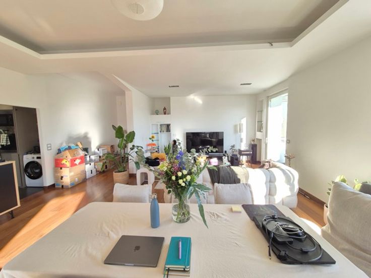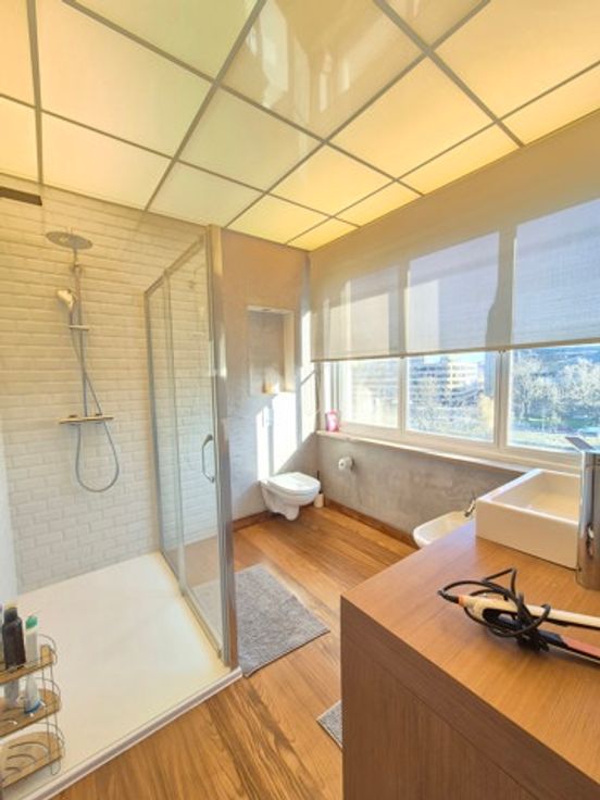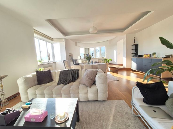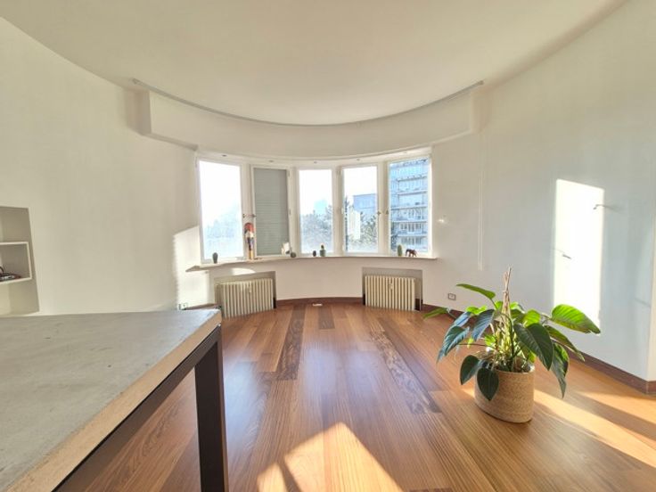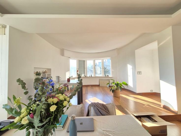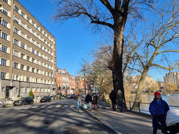 Face aux Etangs d'Ixelles, superbe appartement de caractère (design contemporain et italien) situé au 4ème étage d'un immeuble de coin de grand standing des années 1930. D'une superficie de +/- 150m², il se compose d'un hall d'entrée (lambris en marbre),vestiaire et wc, d'un superbe, vaste et lumineux living sous-sol donnant accès à le terrasse avant (sud-est). Cuisine super-équipée de belle facture, chambre principale donnant sur les étangs avec spacieuse salle de douche en suite et très beau dressing. Donnant sur l'arrière : 1 chambre, salle de bains et seconde chambre d'enfant ou bureau ou dressing (accessible par la première précédente et salle de bains). Terrasse arrière. Vue à 180° allant de la place Flagey au Square de Biarritz, très beau parquet, 2ble vitrage, concierge dans l'immeuble, vue dégagée vers les étangs. Rénovation de qualité. A voir. Garage possible au Square de Biarritz en sus. Luxe et raffinement. A voir! Charges 400 € (communs dont concierge, chauffage central, eau) Ascenseur + ascenseur de service, etc.