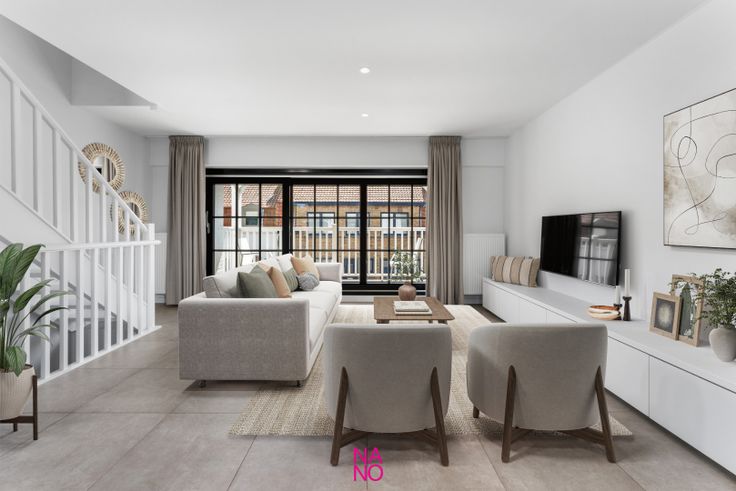 Op het gelijkvloers bevindt zich een lichtrijke studio met keuken, eetplaats, een moderne badkamer met inloopdouche en toilet, en een aangenaam terrasje. De bovenverdieping omvat een duplexappartement met inkomhal, een zonnige leefruimte met een zuidgericht terras, een open keuken en een berging. De tweede verdieping beschikt over twee ruime slaapkamers en een badkamer met inloopdouche en toilet.