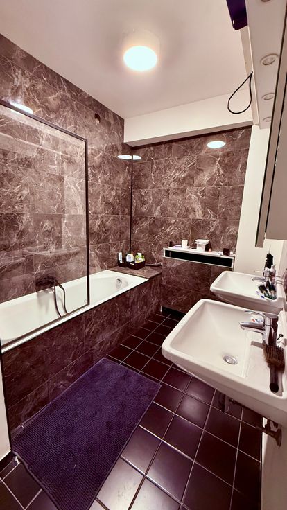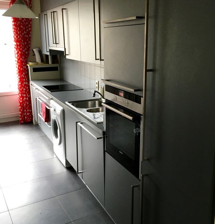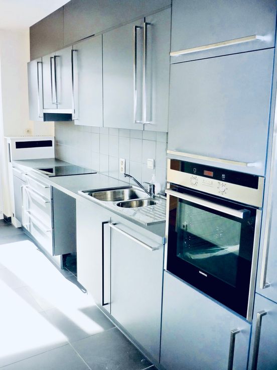 Dans ce joli quartier résidentiel, calme, à l’Altitude Cent, Parc Duden, bel appt rénové 2 ch, +/- 80 m2, contemporain, confortable, lumineux, toutes commodités, deux grandes terrasses ensoleillées (au Sud). Vidéophone, porte blindée. Séjour en parquet (25 m2), 2 ch (15m2/ch), beaucoup de placards pour le rangement. Cuisine spacieuse rénovée hyper-équipée, (lave-vaisselle, four, frigo et congélateur). Hall vers la cuisine avec rangements, WC de courtoisie avec lave-mains. Double vitrage. Hall d'entrée rénové en marbre (10 m2). Hall de nuit avec placards (dressing), SDB rénovée marbre avec baignoire et douche (15m2), dble lavabos. Cave (12 m2). Bus (arrêt Duden), tram (Altitude Cent), supermarchés, écoles, salles de sport, commerces, près du Ring, 10 min de la gare de Forest. Buanderie. Location mensuelle: 1200 €. Provisions pour charges: 200 € (chauffage, eau froide et chaude, communs, ascenseur, gérance) T: 0486 52 05 52. Libre le 1er mars 2025.