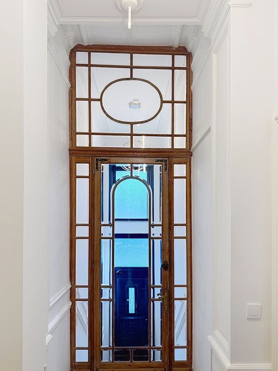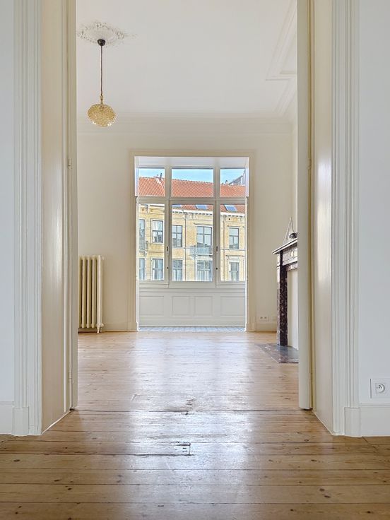 appartment. It features wooden floors with high ceilings and a bow-window.