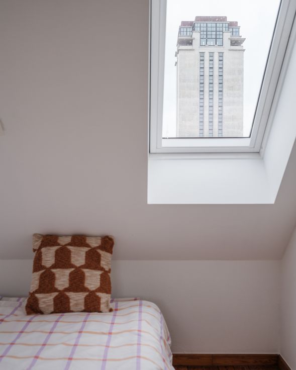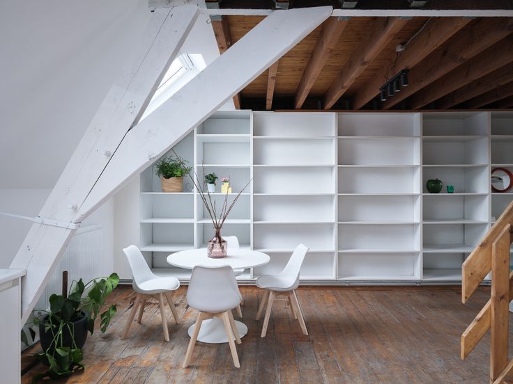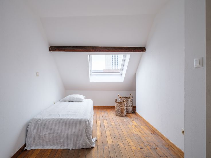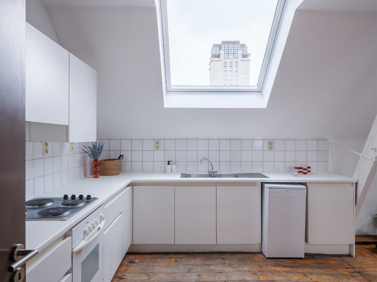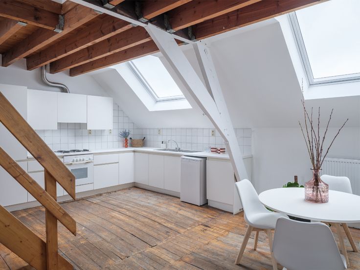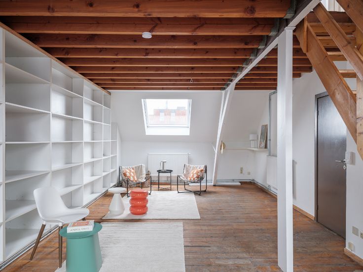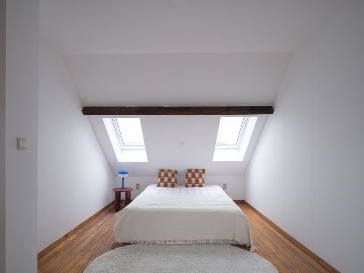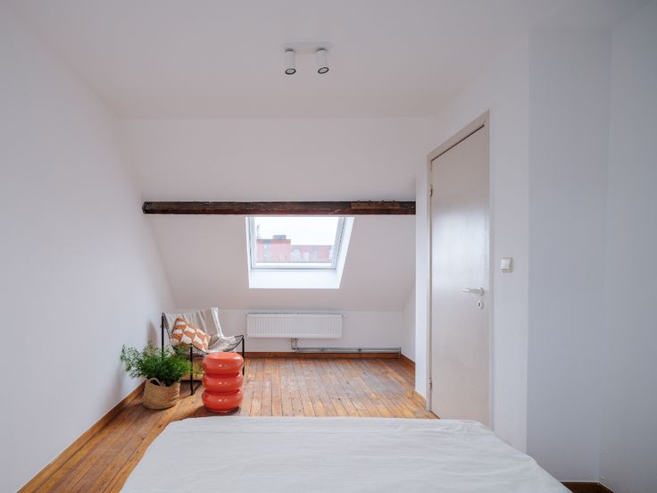 Binnenin vinden we een ruime woonkamer, keuken en badkamer, waarbij een ingebouwde kast zich over de volledige lengte van het appartement strekt. Een binnentrap leidt naar de bovenverdieping, waar zich twee aparte slaapkamers bevinden, elk voorzien van meerdere Velux-ramen.
