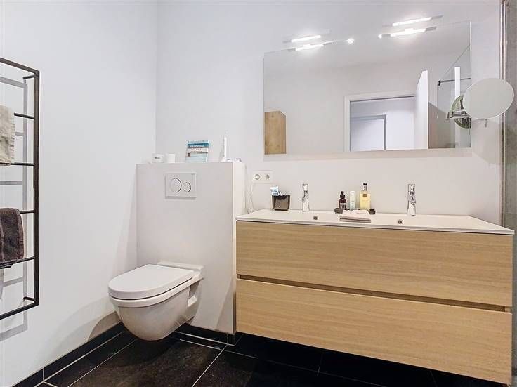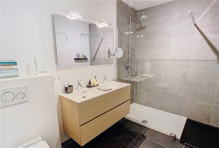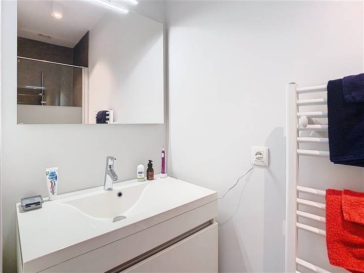 Badkamer 2 verbonden met slaapkamer, wastafel, douchecel en handdoekverwarmer.
