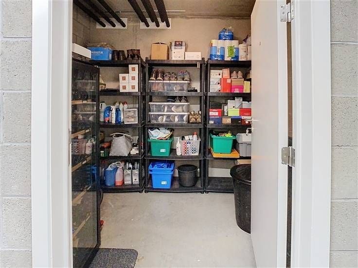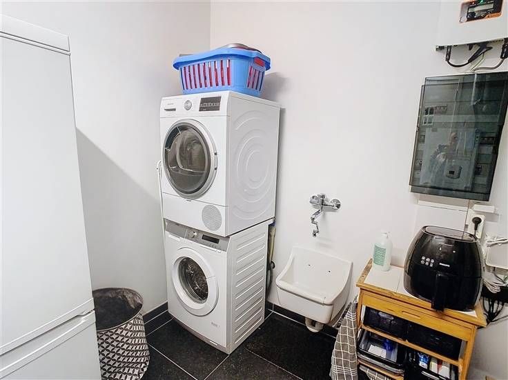 Berging met wasmachine-droogkast, ZEHNDER luchtventilatie D, omvormer zonnepanelen ( vermogen 800 kWh/jaar), uitgietbak, PROXIMUS en TELENET aansluitingen.