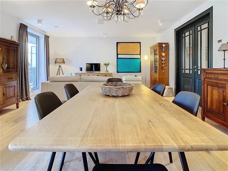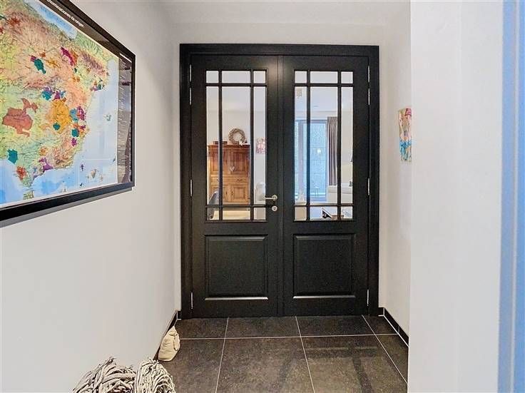 Woonruimte: gelakte hoge dubbele deur, houten vloer