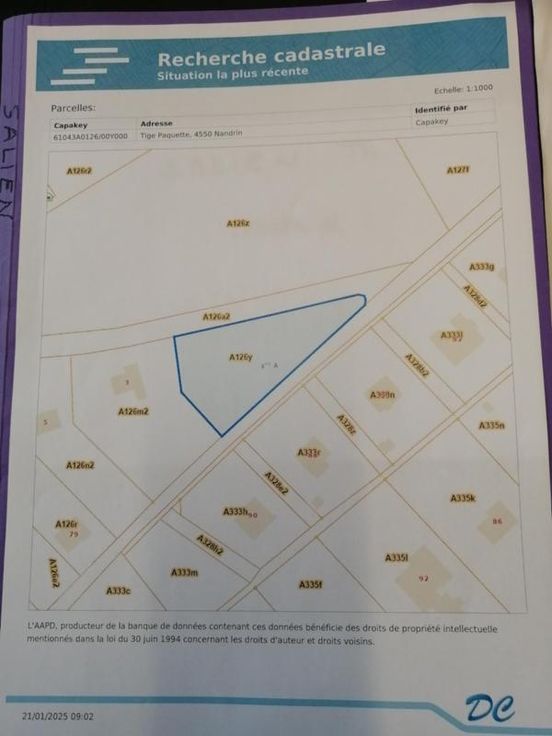 Nandrain – 1ère division – section A numéro 0126 Y A 2 min de la route du Condroz, beau terrain à bâtir, boisé, orienté plein sud, d’une superficie de 2400 m². Dernier lot à bâtir du lotissement, libre de bail et de constructeur. Plans et prescription sur demande. Faire offre à partir de 200.000,00 € Renseignements en l’étude.