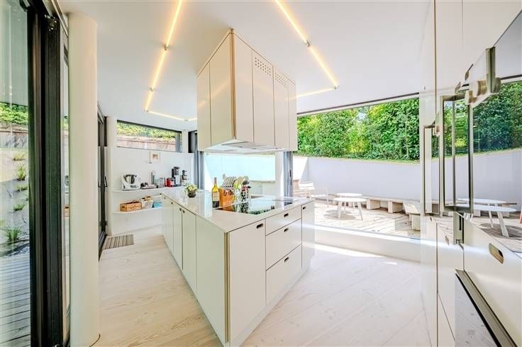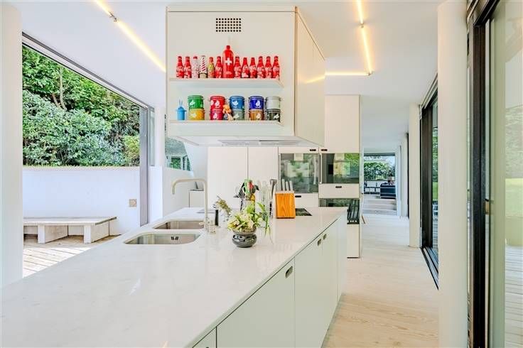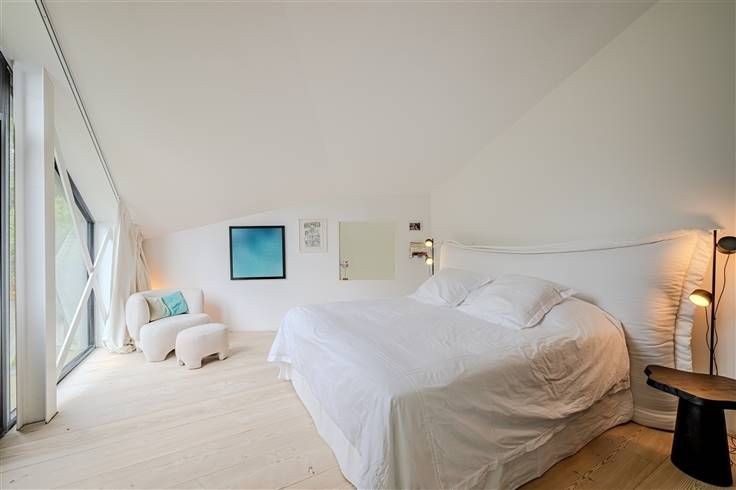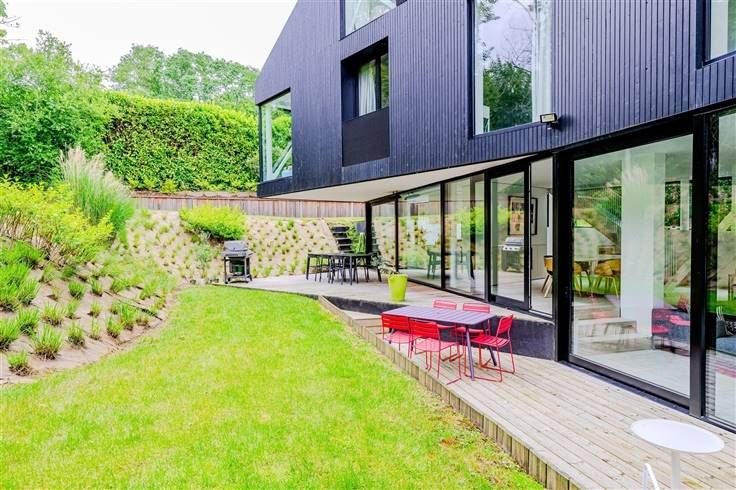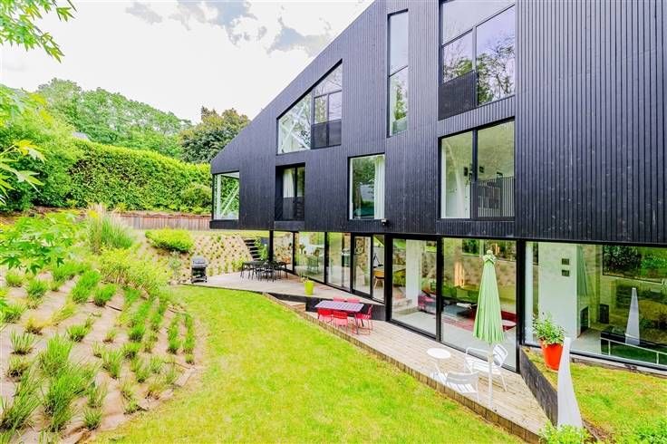 Met grote erkers voor een uitzonderlijke lichtinval en gelegen in een groene omgeving, werd het huis zo ontworpen dat de kenmerken van het terrein, de bomen en de helling zoveel mogelijk bewaard bleven, terwijl de impact op de buurt beperkt bleef door de totale afwezigheid van overhangende uitzichten. Een origineel plan heeft geresulteerd in een huis op 4 niveaus, met zeer grote volumes, voorgesteld als een "loftwoning".