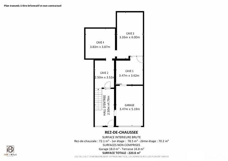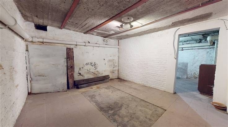 Rez-de-chaussée : hall d'entrée (+/-12 m²), garage (+/-18 m²), 4 caves/cave chaufferie (+/-20, 15, 13 et 9 m²).