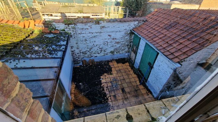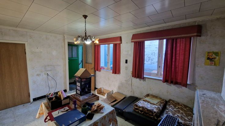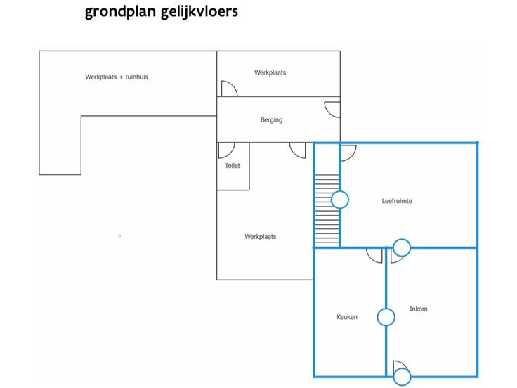 - Gelijkvloers: leefruimte, eetplaats, keuken, toegang tot het koertje, de werkplaatsen en kelder.