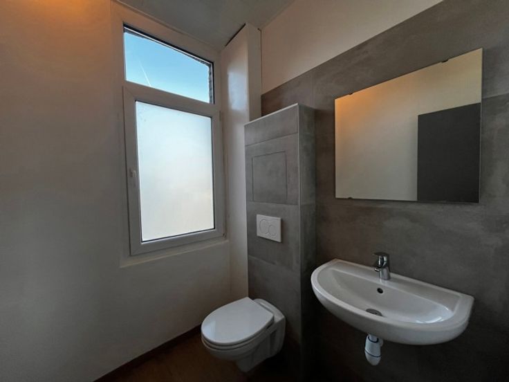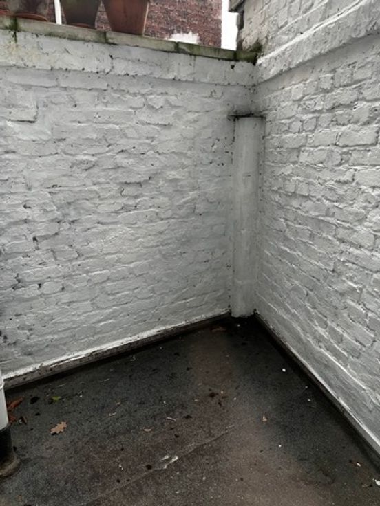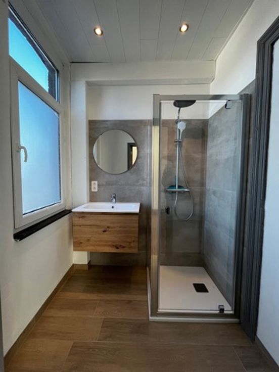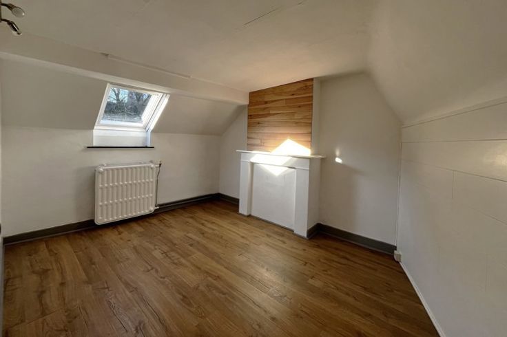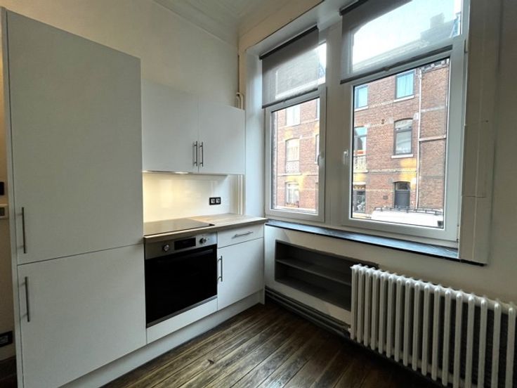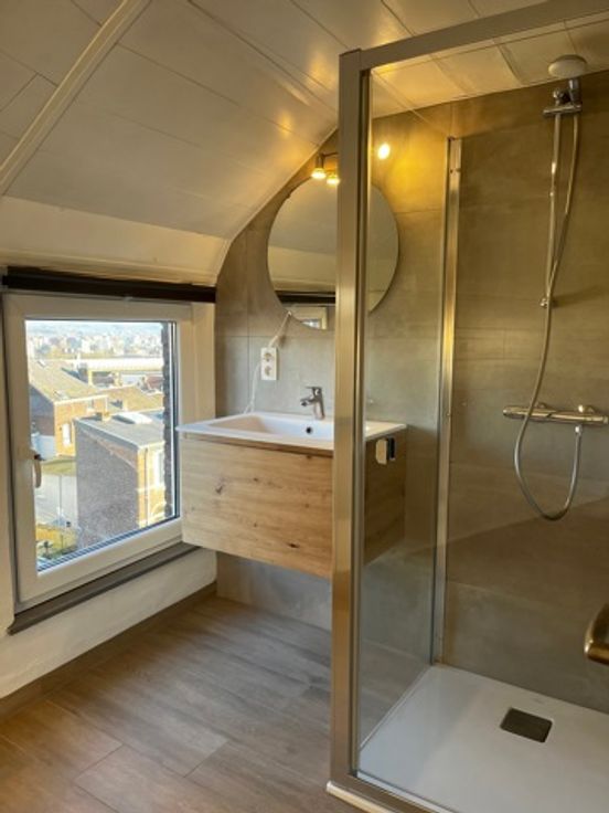 Elle se compose d'un hall d'entrée, une cuisine équipée (frigo, congélateur, vitro, four, hotte, meubles et lave-vaisselle), un salon, 2 chambres avec chacune sa salle de douche, un WC indépendant, une petite cour, et 2 caves. Adoucisseur d'eau, châssis DV en PVC, chauffage central au mazout.