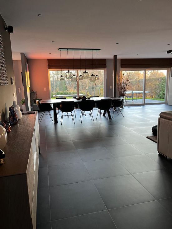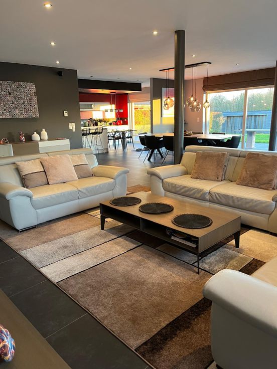 L’espace de vie est très spacieux et lumineux grâce à de grandes baies vitrées qui donnent sur le jardin, foyer au gaz Bodart & Gonay