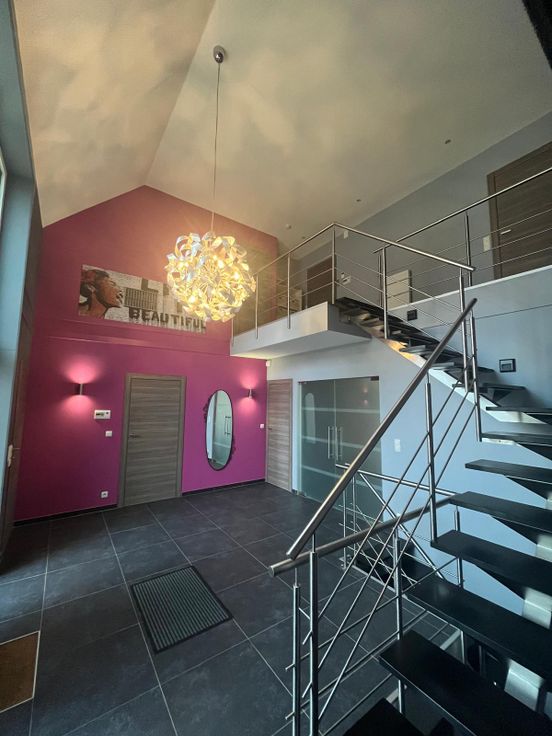 Hall d’entrée avec mezzanine comprenant des toilettes visiteurs et pièce séparée pour le vestiaire. Un bureau et une chambre avec salle de douche privative.