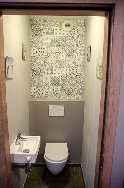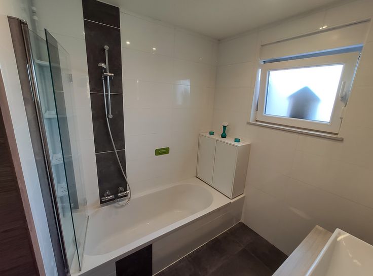 Salle de bain entièrement carrelée avec baignoire.