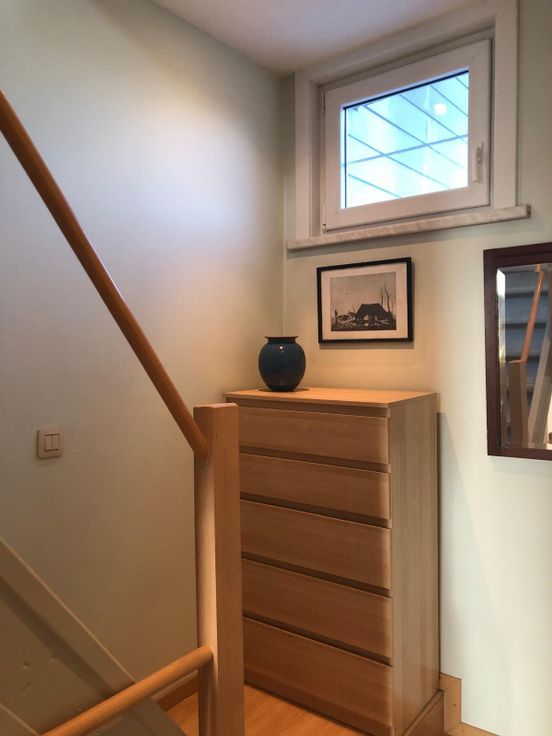 Eerste verdieping: Grote slaapkamer, dressing/bureauruimte, badkamer met toilet.