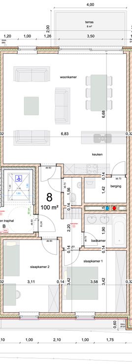 Met een oppervlakte van (bruto) 100 vierkante meter biedt het appartement voldoende ruimte. Er is een grote leefruimte, twee slaapkamers, een badkamer, een toilet en een ruime bergruimte achter de keuken.