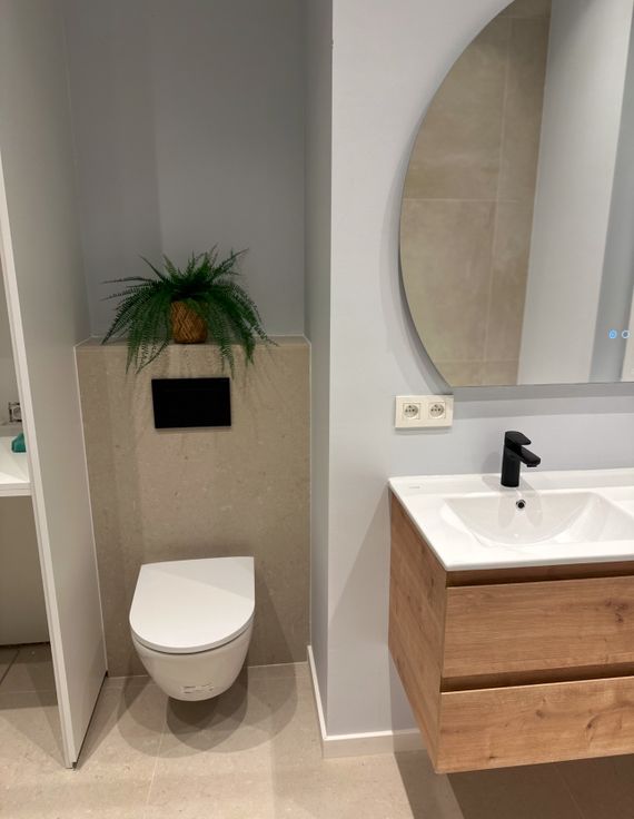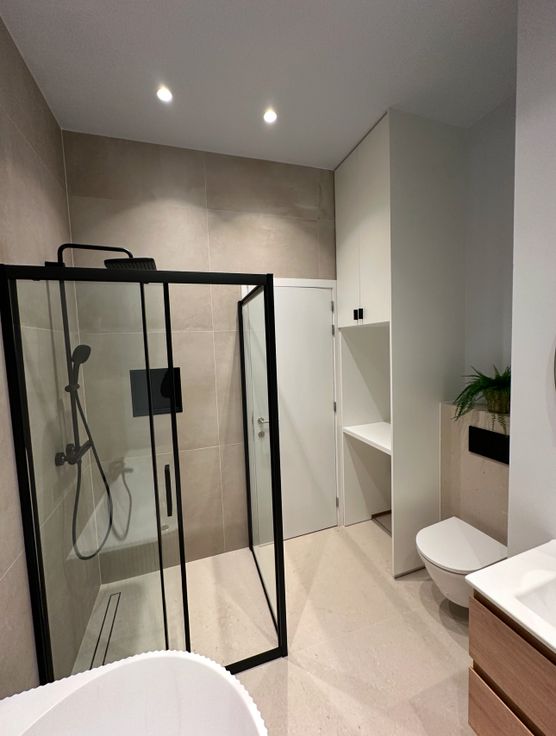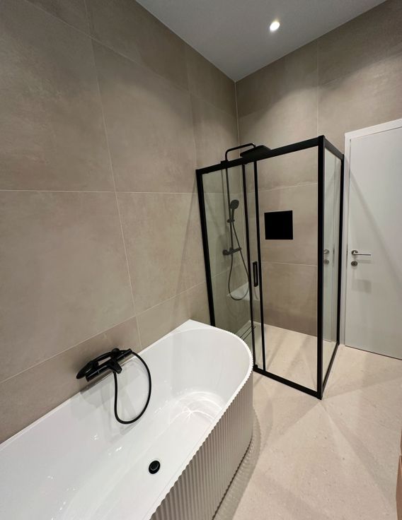 De zorgvuldig afgewerkte badkamer, voorzien van hoogwaardige materialen met inbouwkast, een echte oase van rust en comfort.